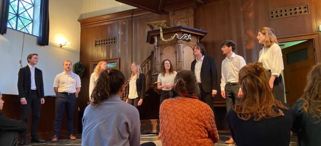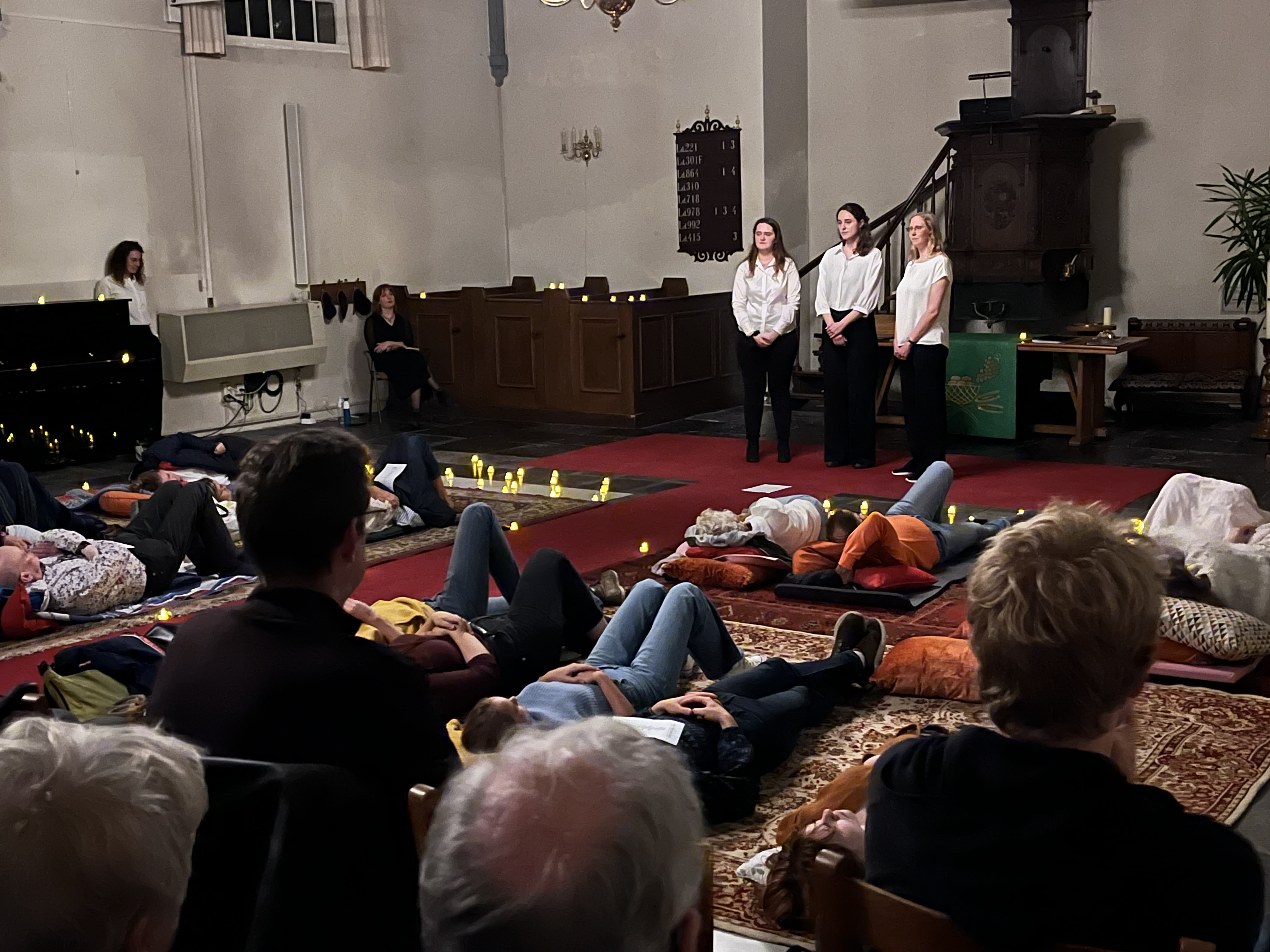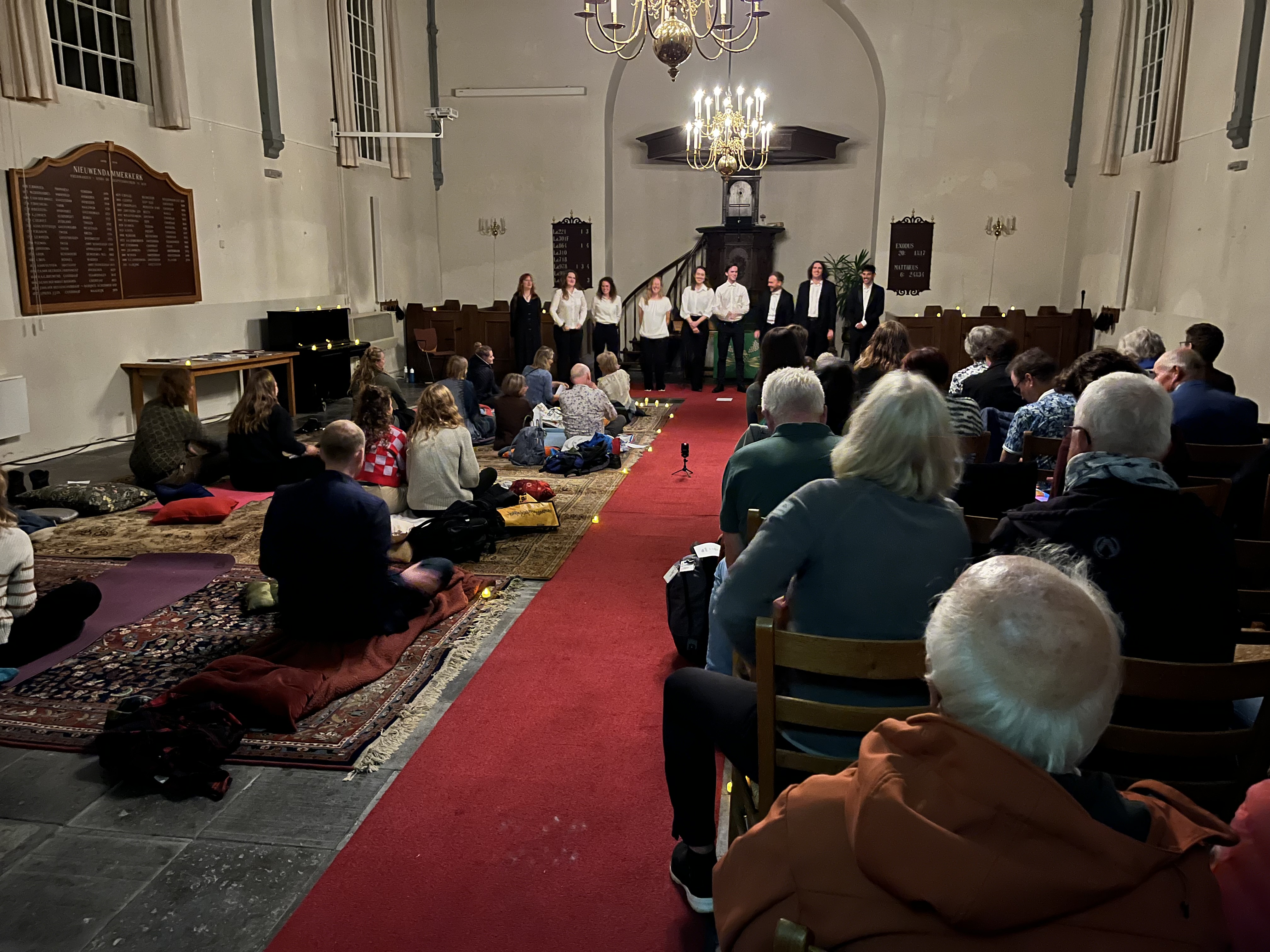 Naast enkele van onze vaste kerkliedjes brachten we voor het eerst “Crossing the Bar” als ensemble ten gehore (tot noch toe zongen we dat samen met Vocaal Ensemble Kwarts), en bleek het collectelied “Lullabye” van Billy Joel verrassend goed te passen bij het thema van de lezing. We kregen veel lieve en enthousiaste reacties van de kerkbezoekers. De kerkdienst is online terug te kijken.