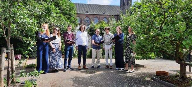 Afgelopen zondag vertrokken we met een auto vol klapstoeltjes en muzikale energie naar Utrecht voor onze laatste concertjes voor de zomerstop. Tussen de fruitbomen van de Catharinatuinen en met de kathedraal op de achtergrond zongen we in totaal voor zo’n tachtig toeschouwers! Het zonnetje scheen, we hebben fijn gezongen, het publiek reageerde enthousiast – kortom, een geslaagde afsluiting van het koorseizoen.